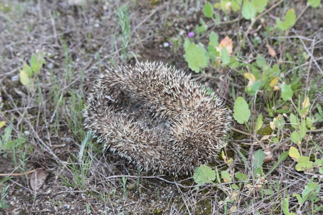 Prop d’aquest niu hi havia bastants cadàvers d’eriçons comuns depredats pel duc, una de les poques espècies amb capacitat per caçar un eriçó. Aquest mamífer es defensa passivament dels perills…quan detecta un, s’atura, es cargola sobre si mateix i es converteix en una bola de punxes. Això li serveix per evitar la depredació de moltes espècies, però no per escapar de les grans urpes del duc. Una vegada el duc s’ha menjat l’eriçó només resta la pell buida amb les punxes, tal i com es pot apreciar a la fotografia.