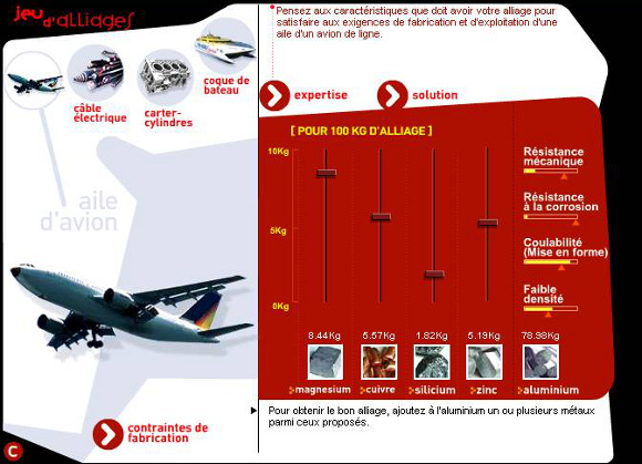 Llavors comença el Joc: cal triar una peça tecnològica i fer el teu aliatge segons un seguit de contraites de fabication. Quant de zinc hem d’afegir a l’alumini? I de Magnesi? Cal fer la barreja, consultar l’apartat Expertise i apropar-nos a les necessitats tecnològiques de cada aplicació.
