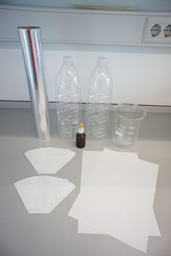 Embolica una de les ampolles amb paper d’alumini i a l’altre afegeix-hi unes gotes de fertilitzant. Deixa les dues ampolles durant uns dies al costat d’una finestra ben il•luminada.