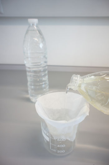 Si disposes d’un microscopi, pots agafar unes gotes de cada una de les ampolles i observar la presència o absència d’algues microscòpiques (microalgues) i veure les formes que poden tenir. Però si no en tens, pots veure la teva proliferació en un filtre de cafè. Per fer això, cal que filtris el contingut de cada ampolla en un filtre de cafè. Deixa eixugar els dos filtres, obre’ls i compara’ls. La diferència de color, amb color un i transparent l’altre, t’indica el creixement de microalgues que has tingut en la primera, gràcies als nutrients (fertilitzant) que li has posat, la llum i ajudat per la temperatura alta. Quan hi ha moltes algues microscòpiques, aquestes es fan visibles a l’ull nu i diem que al mar hi ha una proliferació de microalgues.