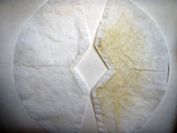 Deixa assecar els filtres de cafè i posa’ls sobre els papers blancs per comparar el color.