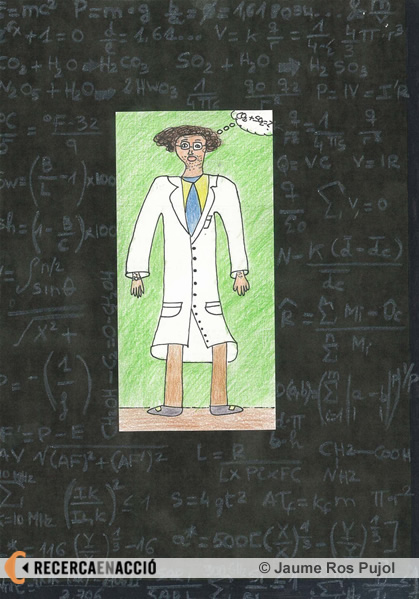 Un científic ens observa, amb aire un xic absent, des del seu ben equipat laboratori, segons aquest dibuix realitzat per Sara Tejada, d'onze anys.
