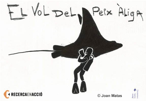 Un científic analitza sota l'aigua els moviments d'una impressionant mena de rajada. El dibuix ha estat realitzat per Joan Matas, de 12 anys d'edat.