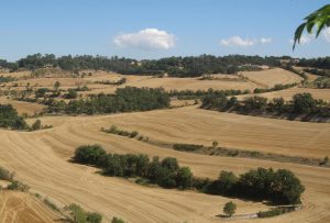 Imatge dels camps de blat de la comarca de La Segarra. Cada hectàrea pot produïr uns 5.000 quilos de blat a l’any, segons la meteorologia, la varietat de cereal i d’altres factors. Si tenim en compte que el consum de pa anual de cada català puja als 33 quilograms per persona, podem començar a fer números interessants…. I quants quilograms consumim, per exemple, de pasta?