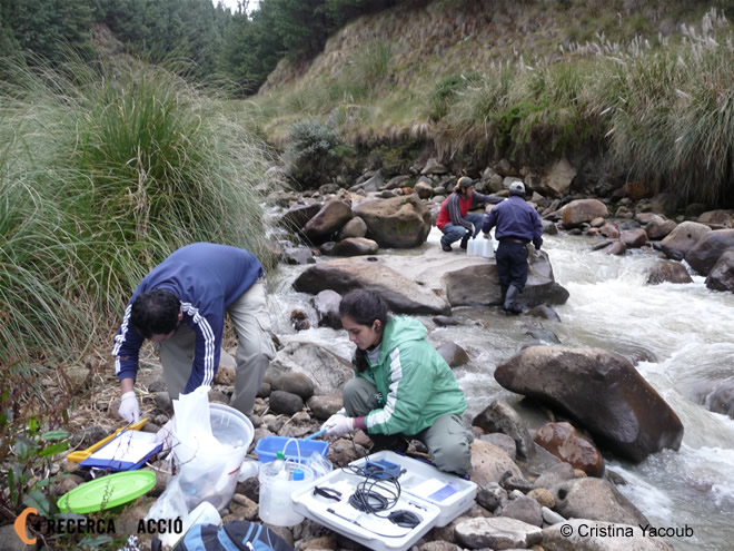 Ara ja toca fer feina! Mentre un s’encarrega de recollir sediments per tota la zona (i després homogeneïtzar-ho bé a una galleda abans de posar a l’ampolla), un altre recull les ampolles d’aigua necessàries per a l’anàlisi al laboratori just al punt de més caudal i més al centre del riu possible, altre mira el pH i conductivitat del riu amb el multi paràmetre. Després en grups es mesura el caudal, s’acaba d’omplir la fitxa i es posa el preservant necessari per a cada ampolla d’aigua. Perquè ningú s’equivoqui, portem una llibreta a on es troba escrit quin preservant va amb quina ampolla!