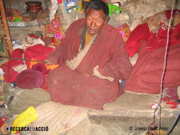La cova no fa més de dos metres de fondària per dos d’amplada. Amb prou feines hi caben dues persones i en cap moment és possible estar-s’hi dret, ja que d’alçada fa poc més d’un metre. És clar que l’ermità passa gairebé tot el seu temps reclòs a la cova, assegut a terra i meditant a les fosques. Vaig identificar que en un lloc privilegiat del seu altar hi ha col·locat un llibre. Es tracta d’una de les tres versions de la biografia sagrada (“Zermig”) de Tonpa Shenrap, el fundador de la religió bon. Sense que li amoïnin les condicions espartanes en què viu, aquest asceta només deixa la meditació per acollir hostes com nosaltres, que des de molt lluny ens vam apropar, interessats i encuriosits, a conèixer Khyungdzong, una mica millor.