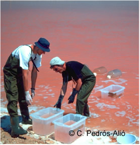 Però el que ara ens interessa és el color dels cristal·litzadors, les basses on precipita la sal. Aquests cristal·litzadors són d’un color vermell granat intens. I aquest color es deu als microorganismes que hi viuen: una barreja de bacteris i arqueus capaços de suportar les condicions tan extremes de salinitat. Els microorganismes són, per definició, invisibles a l’ull, i cal fer ús dels microscopis per veure’ls. Però en els cristal·litzadors s’acumulen en quantitats tan grans, fins a 100 milions per mil·lilitre, que els seus pigments tenyeixen l’aigua del seu color. Aquests microorganismes, a més de l’interès extraordinari de la seva fisiologia extrema, són font de productes útils, com és ara polisacàrids, polímers plàstics i rodopsines, unes proteïnes que capturen l’energia de la radiació solar i que s’utilitzen fins i tot per emmagatzemar informació en carnets d’identitat.