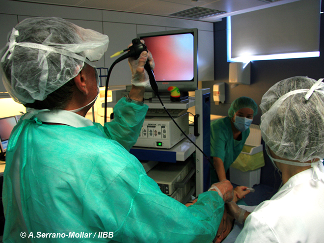 Quan fas una cosa per primera vegada no pots evitar els nervis. La intervenció era senzilla en principi. Les cèl·lules s’havien d’administrar amb un broncoscopi. Un tub que s’introdueix pel nas i que va baixant cap a dins dels pulmons controlat des de fora pel metge. A l’extrem del tub hi ha una minicàmera de vídeo que permet anar dirigint per on passa. També hi ha un sistema per ficar el líquid amb eles cèl·lules que havíem preparat. Per posar-les es van separar en unes quantes dosis que el doctor Xauvet anava dipositant en diferents indrets del pulmó.