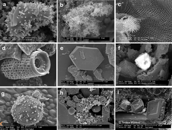 En aquesta fotografia pots observar diverses partícules. És el que s’observa si s’utilitza un microscopi electrònic de rastreig. L’equip científic les estudia per saber si tenen un origen natural o si han estat creades pels humans (origen antropogènic). Tant unes com les altres poden afectar a la contaminació atmosfèrica.