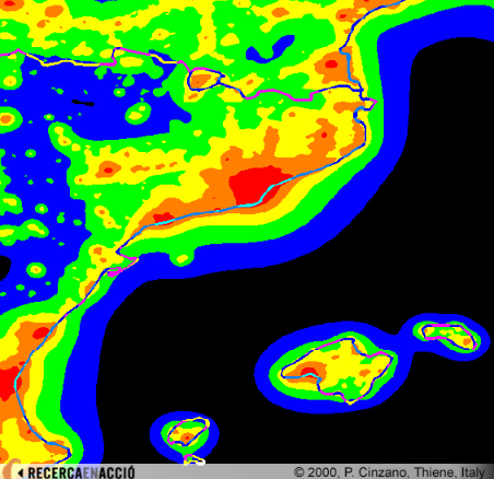 Mapa de la llum artificial vista des del cel amb el satèl·lit dels EEUU anomenat Defense Meteorological Satellite Program (DMSP). A les zones vermelloses és on hi ha més contaminació lumínica, mentre que a les blaves és on n’hi ha menys. El Montsec es troba justament en una zona blava, com bona part del Pirineu i Prepirineu central, mentre que hom pot reconèixer les àrees metropolitanes catalanes per la seva vermellor.