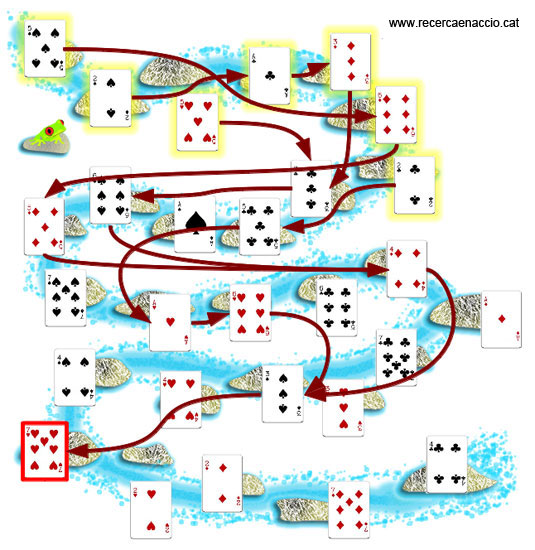 Cal, però, tenir cura. És possible que, situant les cartes a l’atzar, el riu s’acabi abans que els camins convergeixin del tot i, en aquests casos, la granota es pot equivocar.