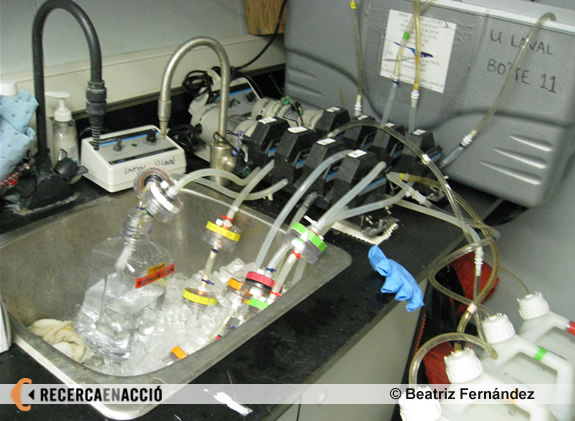 Quan tot està preparat vaig a recollir l’aigua. Sempre agafem aigua de quatre fondàries diferents. Pel DNA agafem 6 litres i per l’RNA, que triga més a filtrar, agafem 4 litres. La filtració sol durar unes 5 hores i un cop finalitzada hem d’aturar les bombes i guardar els filtres en vials de 2 ml amb solucions tamponadores que preserven els filtres fins al seu posterior processament.