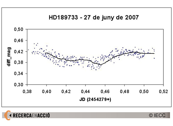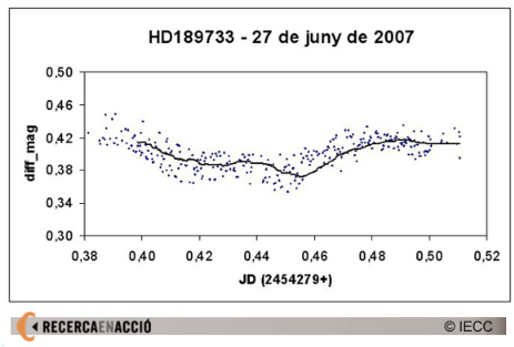 La detecció de planetes extrasolars no s’ha pogut dur a terme fins fa pocs anys perquè suposa un gran desafiament per a l’instrumental astronòmic. S’ha de tenir en compte que un planeta és extremadament més feble que l’estrella al voltant de la qual orbita (típicament, la seva brillantor és un milió de vegades més feble que la de l’estrella). Com, a més, vist des de la Terra qualsevol planeta extrasolar es troba extremadament a prop (en distància angular) de la seva estrella, la seva detecció és molt complicada. De fet, la major part dels planetes no s’han detectat directament, sinó gràcies a diversos efectes indirectes que provoca la seva presència. Aquests efectes poden ser, entre d’altres, astromètrics (la influència gravitacional del planeta fa modificar lleugerament la posició de la seva estrella al cel), d’efecte Doppler a les velocitats radials (per la mateixa causa que en el cas anterior, les línies espectrals de l’estrella mostren corriment Doppler degut a la presència del planeta) i fotomètrics (quan un planeta transita per davant de l’estrella, oculta part de la seva superfície i, per tant, l’estrella perd una mica de la seva brillantor quan s’observa des de Terra). Des de l’Observatori Astronòmic del Montsec hem realitzat recentment diverses observacions de trànsits de planetes extrasolars per davant de les seves estrelles, i en aquest missatge us mostrem un dels exemples, corresponent al planeta HD 189733 b.
