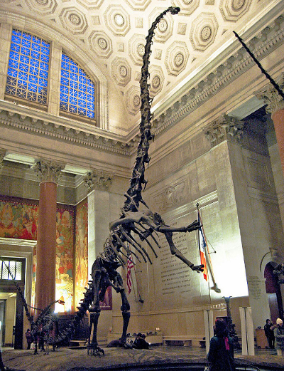I és que el American Museum of Natural History concentra una de les millors col·leccions de fauna del món. Especialment interessant és la secció de fòssils del centre. Aquí hi ha, per exemple, l’esquelet fòssil d’un Apatosaurus (o Brontosaurus) descobert el 1890 i muntat el 1905. Es tracta d’un dinosaure que amida 22 metres de llarg, de manera que el seu esquelet aconsegueix que ens sentim molt petits, i fins i tot empetiteix una mica l’enorme Tyrannosaurus que té al costat. És clar que en una altra sala trobem els esquelets d’un Barosaurus protegint la seva cria de l’atac d’un Allosaurus, una de les imatges més emblemàtiques del Museu i més espectaculars si tenim en compte que el Barosaurus és tan gran que el seu cap queda a uns 17 metres del terra de la sala.