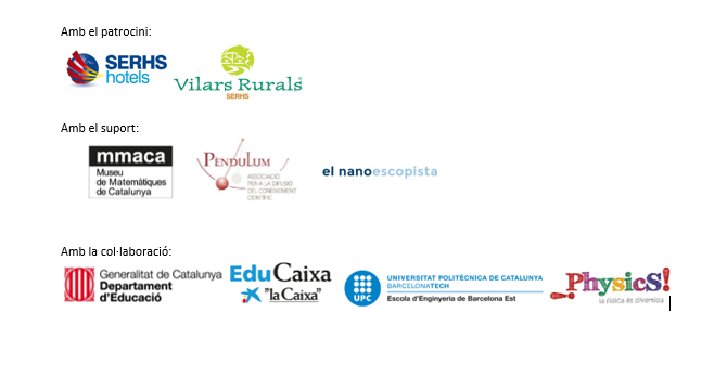 X(p)rimenta 2020 compta amb patrocini de SERHS hotels; el suport de Pendulum, el MMACA i el grup El Nanoescopista; i la col·laboració del Departament d’Educació de la Generalitat de Catalunya, EduCaixa “la Caixa”, l’Escola d’Enginyeria de Barcelona Est (EEBE) de la Universitat Politècnica de Catalunya (UPC) i Physics!.