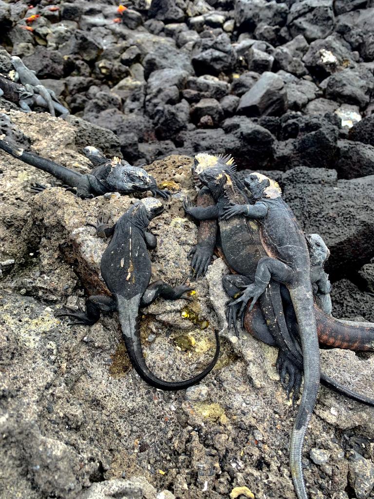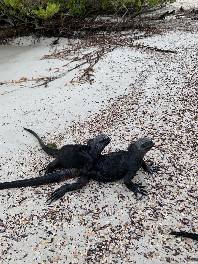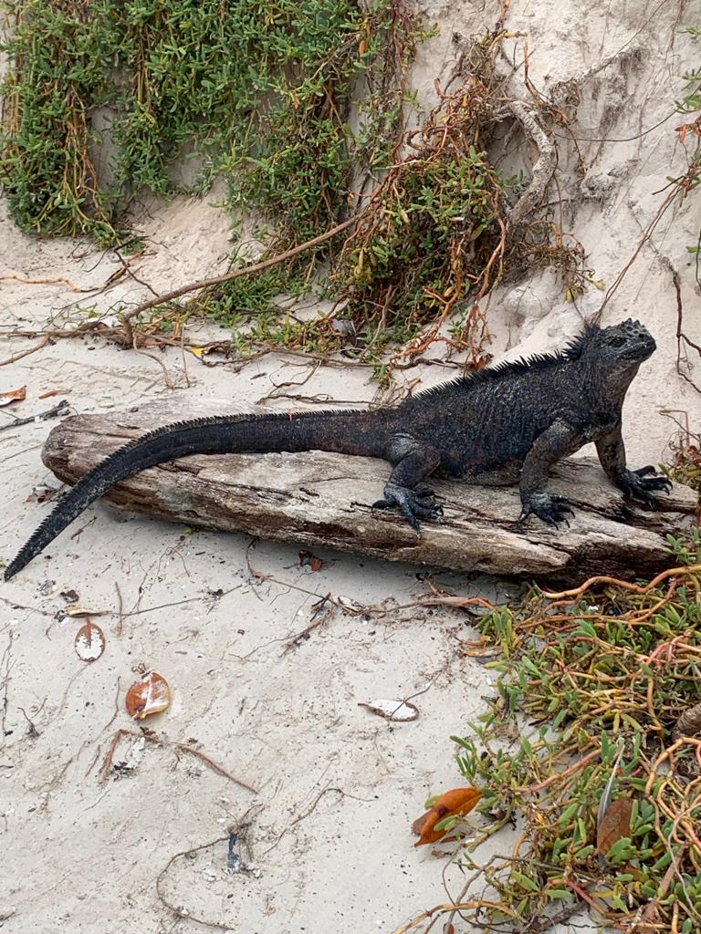 Abans d’embarcar, aprofitem per visitar Tortuga Bay, on trobem nombroses iguanes marines prenent el sol a la platja. Les iguanes de Galápagos (Conolophus subcristatus) tenen un aspecte semblant a un drac i són les úniques iguanes marines del món. S’han adaptat per alimentar-se d’algues sota l’aigua i poden submergir-s’hi per buscar menjar.