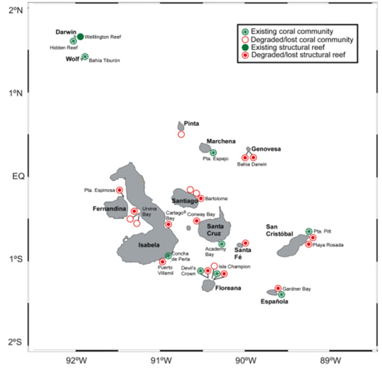 Imatge: Localització i estat dels esculls de corall a les Illes Galápagos, després de l’esdeveniment El Niño de 1982–83. Font: Glynn et al., 2018. Glynn, P.W., Feingold, J.S., Baker, A., Banks, S., Baums, I.B., Cole, J., Colgan, M.W., Fong, P., Glynn, P.J., Keith, I., Manzello, D., Riegl, B., Ruttenberg, B.I., Smith, T.B., Vera-Zambrano, M., 2018. State of corals and coral reefs of the Galápagos Islands (Ecuador): Past, present and future. Marine Pollution Bulletin 133, 717–733. https://doi.org/10.1016/j.marpolbul.2018.06.002