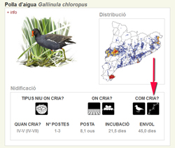 En canvi, la fitxa de la polla d’aigua ens mostra que és un ocell nidífug, amb un apropiat símbol de les petjades del pollet marxant.