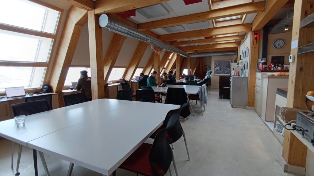 La base té una aparença molt futurística, però per dintre és molt acollidora amb interiors de fusta molt agradables i equipament modern i ben mantingut. Em recorda també a la nova base Juan Carlos I, inaugurada el 2018, que també té molt bones instal·lacions. Aquesta base es va inaugurar el 2009 i és l’única base belga a l’Antàrtida. Però la seva gran particularitat és que és l’única base zero emissions del continent. Per posar-vos en context, totes les bases antàrtiques generen part de l’energia amb motors dièsel. Aquesta base està feta per no necessitar cap mena d’energia externa, ja que tota ella s’aconsegueix mitjançant turbines eòliques i plaques solars.