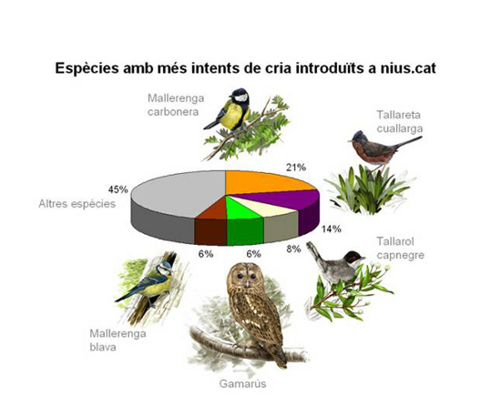 El nombre de dades de cria introduïdes a nius.cat va creixent. A hores d’ara ja portem enregistrats 159 intents de cria de 33 espècies diferents.