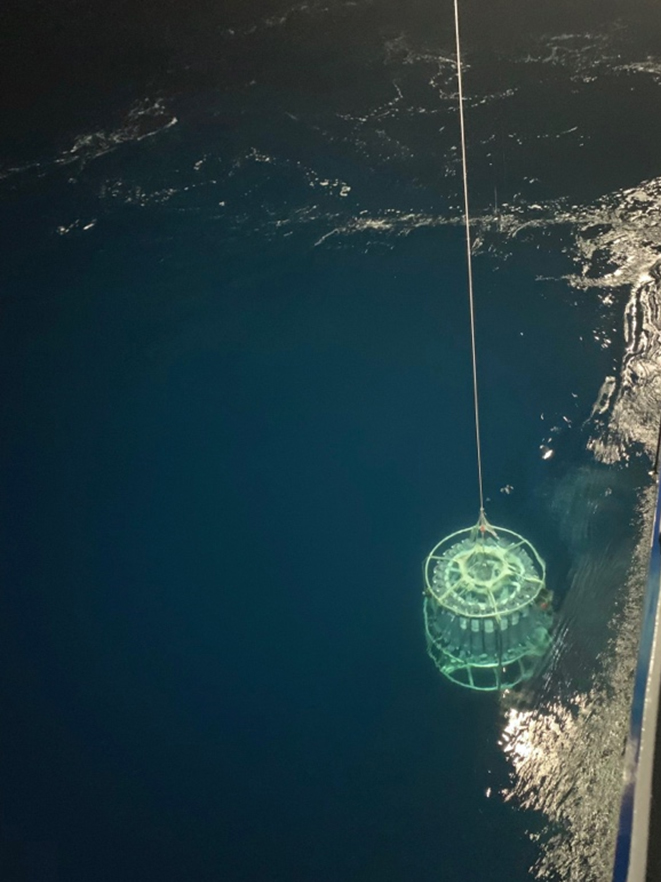 Per estudiar els corrents, hem llançat el CTD-Roseta com un io-io contínuament durant 12 hores seguides. Amb l’ajuda els enginyers a bord i una grua, es deixa baixar suaument la Roseta (a uns 60 metres per minut) fins a 2.000 m, un procés que triga unes 2 hores. Durant el descens i ascens, des del laboratori podem veure les dades que s’estan adquirint en temps real, i elaborem perfils de temperatura, salinitat, oxigen, i terbolesa. Gràcies al CTD io-io hem pogut observar un patró cíclic en la temperatura i direcció de les corrents, el que ens fa pensar que podria estar relacionat amb l’efecte de les marees.