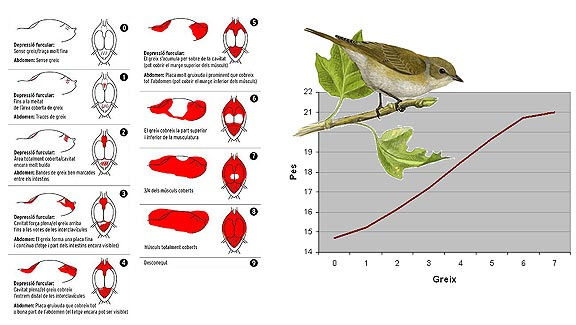 La correlació entre l’acumulació de greix i el pes total dels ocells és molt gran. En el cas del tallarol gros, un punt més de greix equival a uns 0,9 grams més de pes.