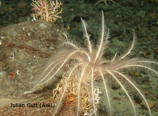 D’altra banda hi ha el crinoïdeu Promachocrinus kerguelensis. No és un animal sèssil, com pot semblar, sinó que es pot desplaçar nedant i movent els braços com una ballarina! Són filtradors de partícules petites i es troben normalment assentats sobre d’altres organismes o sobre roques. Poden arribar a formar poblacions denses sobre tota mena de fons, molt colonitzats per altres espècies o bé sense quasi altres organismes bentònics.