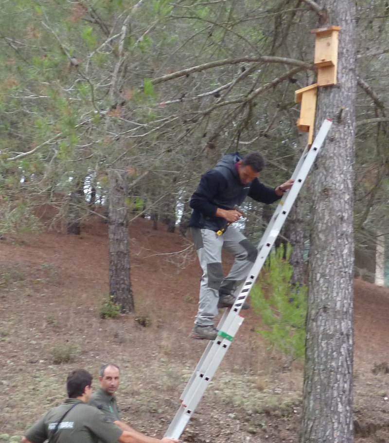 Imatge: Cos d’Agents Rurals del Priorat, en col·laboració amb tècnics i la brigada del Parc Natural de la Serra de Montsant, en el moment de col·locar un seguit de caixes refugi per a ratpenats a Cornudella de Montsant.
