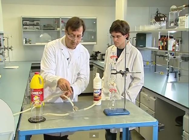 Al vídeo es veu l’experiment que s’ha dut a terme, de forma controlada i amb estris de laboratori, en barrejar aquests 2 compostos. Es pot veure com el clor resultant té un efecte decolorant sobre una flor.