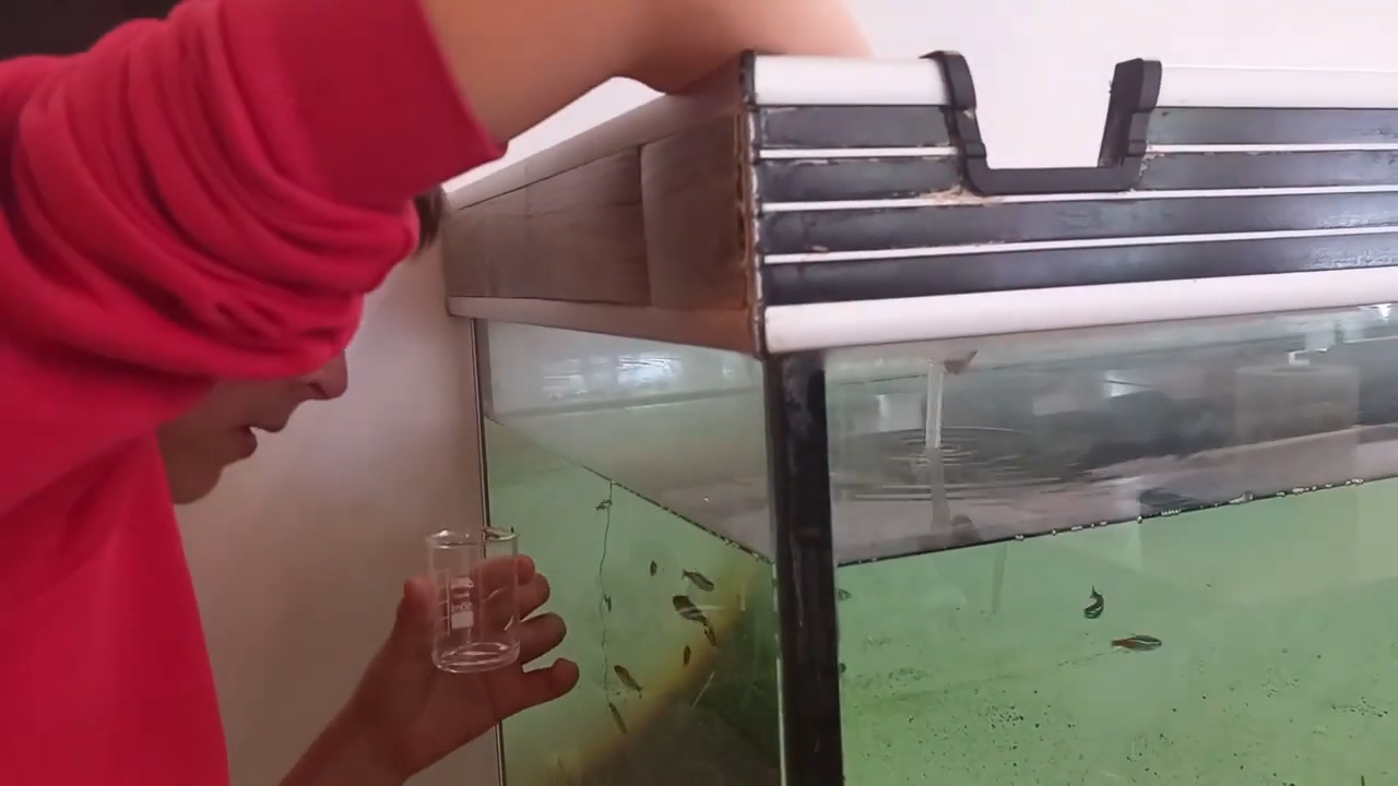 - Seguidament, mostregem aigua de la peixera i la posem en un vas de precipitats.