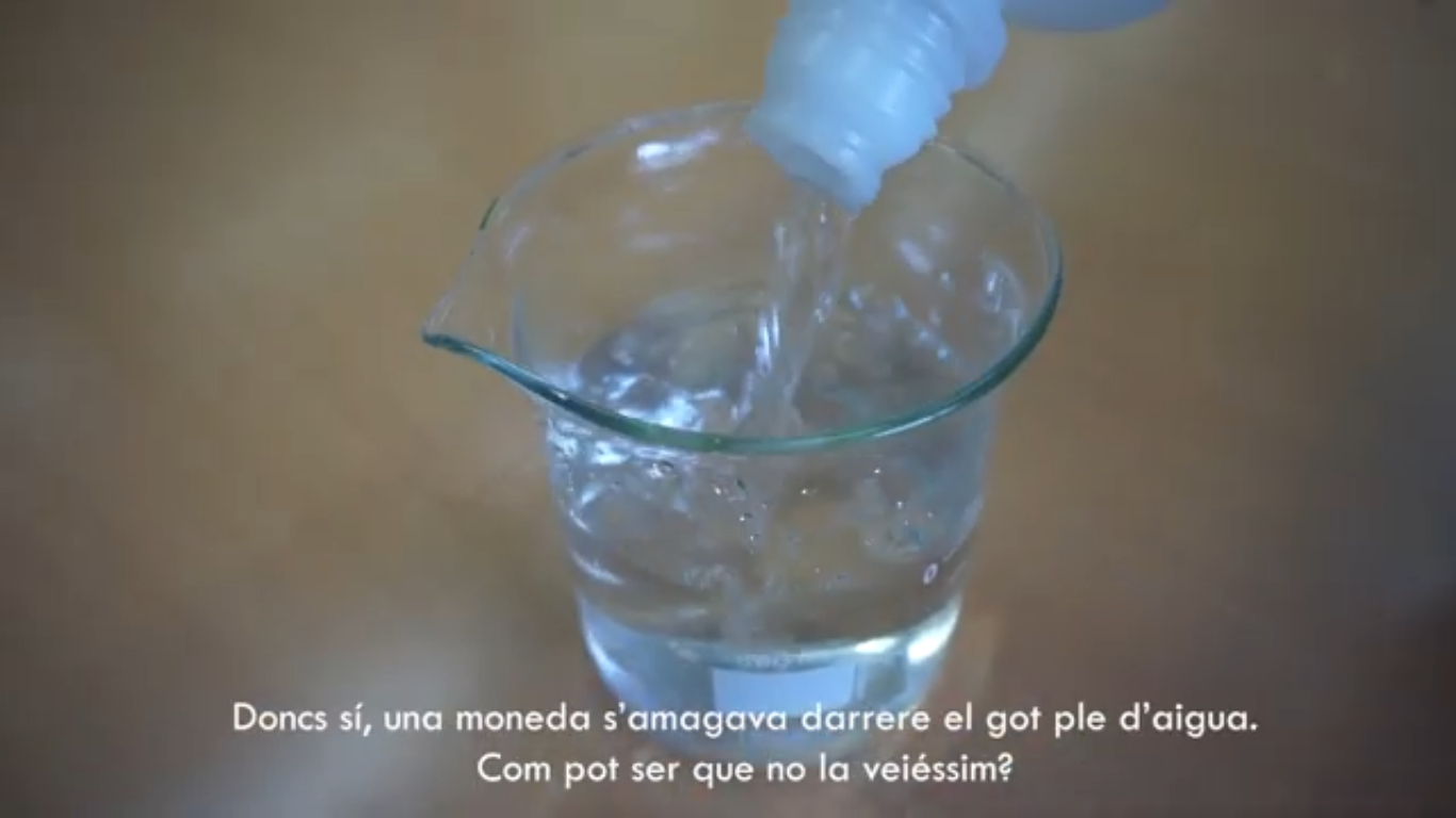 Observant a través del vas de precipitat ple d’aigua, podem jugar a veure i deixar de veure els objectes que s’amaguen darrere. Reduint la capa d’aire que hi ha entre els objectes i el vidre del got, podem aconseguir veure’ls. Aquest fenomen segueix el principi de l’efecte túnel, un fotó pot travessar una paret quan ambdós són de dimensions molt petites