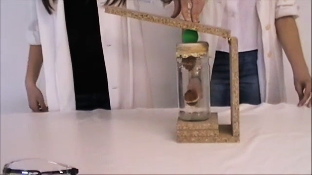 La pressió hidrostàtica és la pressió que exerceix un líquid en repòs, sobre un cos submergit degut a la columna de líquid que té sobre ell. La pressió hidrostàtica és directament proporcional a la densitat del líquid, profunditat i gravetat. Aquest experiment demostra que la pressió hidrostàtica afecta els cossos de manera diferent. Per fer-ho, dins de la nou posen dues pedres i un globus amb diferents quantitats d’aire, i com a conseqüència, la densitat (flotabilitat) de cada nou es diferent. El resultat d’aquest experiment és el canvi de posició que experimenten les nous modificades, depenent de la pressió que s’exerceix sobre la membrana.