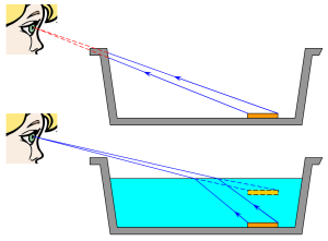Aquest és un experiment realitzat pel físic Jordi Mazon, professor de la UPC, per a la televisió 8TV. Posem aigua en un cossi, i la moneda sembla ocupar un lloc on, de fet, no hi és, degut al canvi de direcció ocasionat per la reflexió de la llum. És el mateix principi que explica els miratges del desert o de les carreteres asfaltades i calentes, degut a capes d’aire de diferents temperatures.