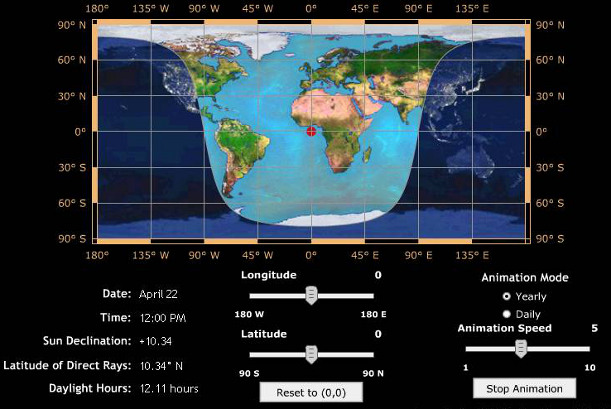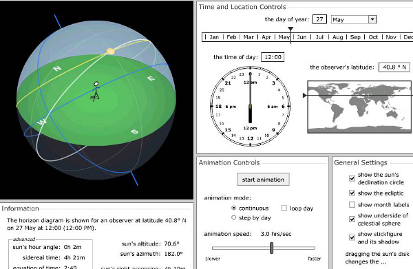Un altre simulació ens mostra el recorregut del Sol pel cel en funció de l’hora i de la latitud que triem. És fins a cert punt complementària de l’animació que ensenya la incidència dels raigs solars a la Terra en funció dels mesos de l’any i de la inclinació terrestre en cada moment.