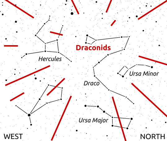 Pregunta proposada per: M Teresa Escalas S’ha de mirar N-NW a bastanta alçada la primera part de la nit i baixar i situar-se més cap al nord a la segona meitat de la nit. Els meteors sembla que surtin de la constel·lació de Draco, per això es diuen Dracònids....