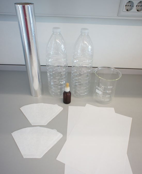 Agafa aigua de mar i afegeix un xic de fertilitzant per a plantes. Al cap d’uns dies podràs veure el resultat. Material necessari: 2 ampolles d’aigua embotellada de 1,5 l Paper d’alumini Líquid fertilitzant 2 filtres de cafè 1 vas de precipitats (o similar) 2 fulls...