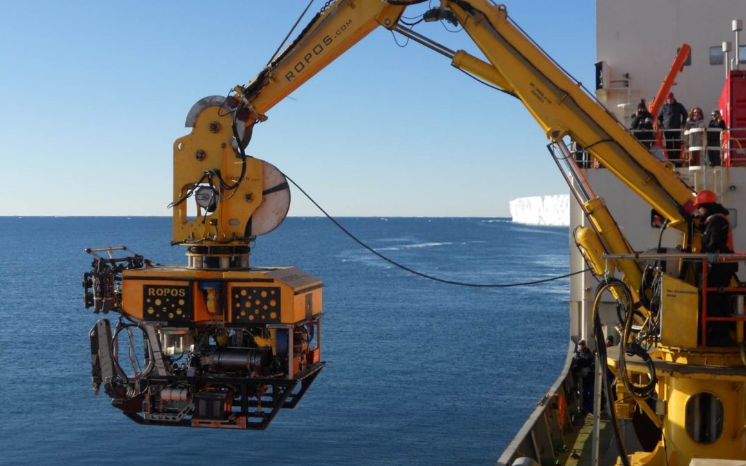 Imatge: el robot submarí ROPOS en el moment que és posat a l’aigua. Som a 67°S. La glacera Mertz té una amplada d’uns 20 km, per això mirem on mirem tot són penya-segats de gel. Com tantes altres gran glaceres antàrtiques, baixa del continent amb tanta potència...