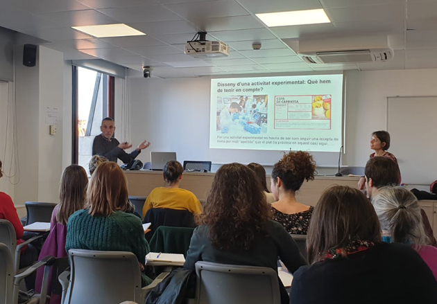 Mar Carrió i Marcel Costa, del GRECS, van parlar en aquest taller sobre el material didàctic que cal desenvolupar i a més donen orientacions per a poder elaborar-lo. Els joves científics participants van treballar en grups petits per tal d’elaborar el disseny de l’activitat teòrica i pràctica, per després posar en comú i avaluar entre iguals els primers esborranys. L’objectiu final és poder elaborar material didàctic perquè els investigadors i investigadores puguin usar-lo per despertar l’interès dels estudiants en genètica i biotecnologia i la recerca a l’aula de secundària.