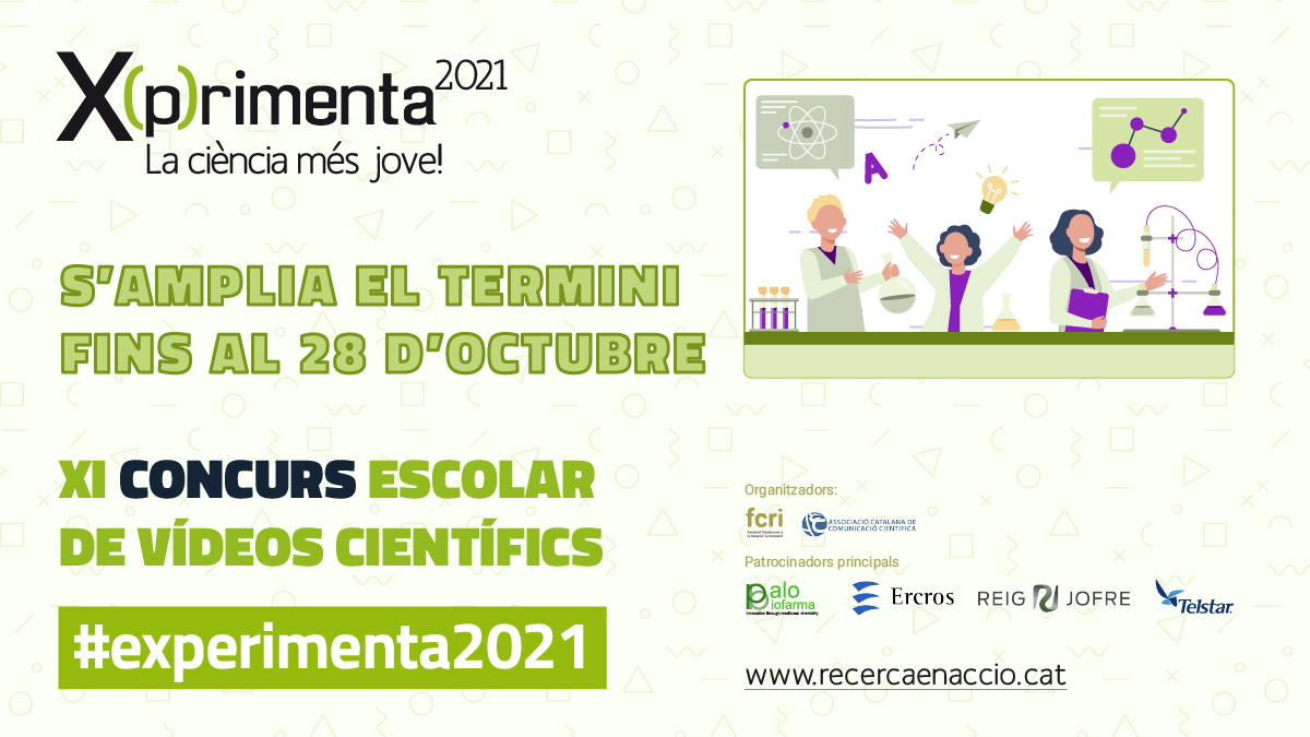 A causa de l’actual situació sanitària causada per la COVID-19, la qual afecta el normal funcionament de molts centres escolars i en limita l’ús dels laboratoris, i per tant la participació en el concurs, l’organització ha decidit ampliar el termini per presentar els vídeos al concurs X(p)rimenta 2021. Els vídeos que s’han enviat fins ara seran valorats una vegada el termini per presentar els vídeos hagi finalitzat.